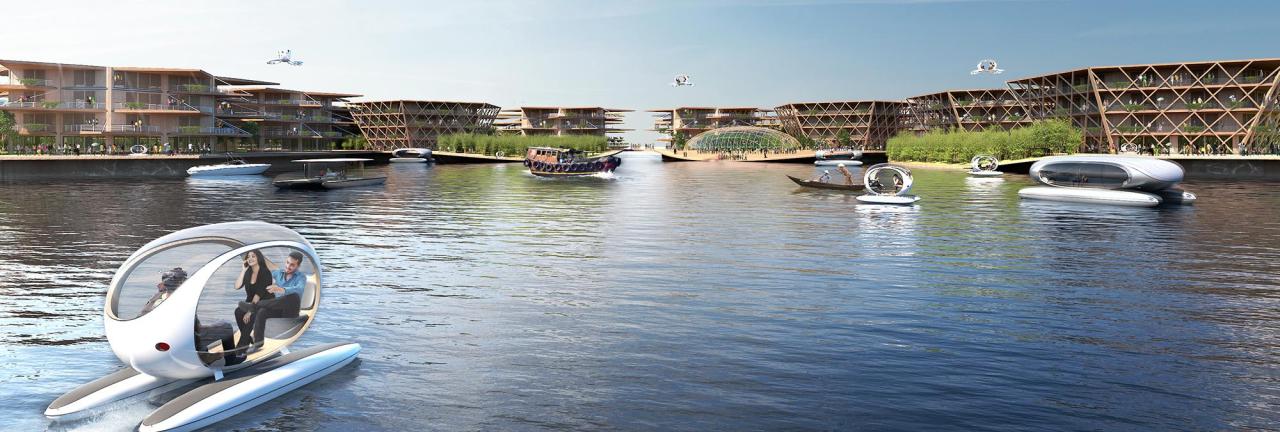 Mobility within the floating city emphasizes clean, quiet movement. Electric gondolas travel along cable networks suspended between platforms, offering panoramic views while using 90% less energy than road vehicles. For inter-platform travel, residents use app-shared electric boats or walk along sheltered gangways. Personal vehicle ownership is discouraged through design; there are no parking spaces, only loading zones for essential deliveries.